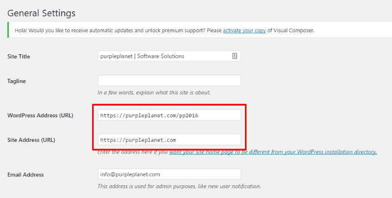 - Update the WordPress Address and Site Address fields.