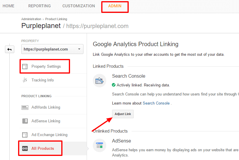 - Click the Adjust Link button » choose your Google Search Console account from the list.