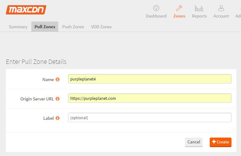 - Click the Create Pull Zone button. You will probably have to delete a previously created HTTP-based pull zone.