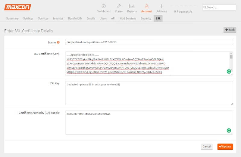 It was hard to find instructions on setting up MAXCDN to use an SSL connection, so I had to contact their support for help. Below are detailed instructions on how to setup SSL within MAXCDN, for a single domain SSL license, as well as for the wildcard license. If you are using another Content Delivery Network, I advise you to contact their support, before losing too much time on trying to figure out how to set up everything correctly.