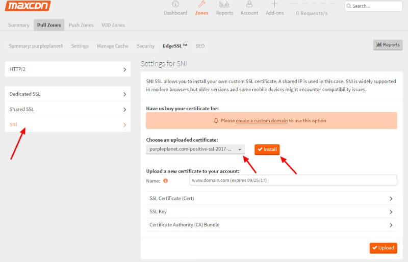 After you’ve successfully uploaded your certificate to CDN, you have to install it in the SNI tab.