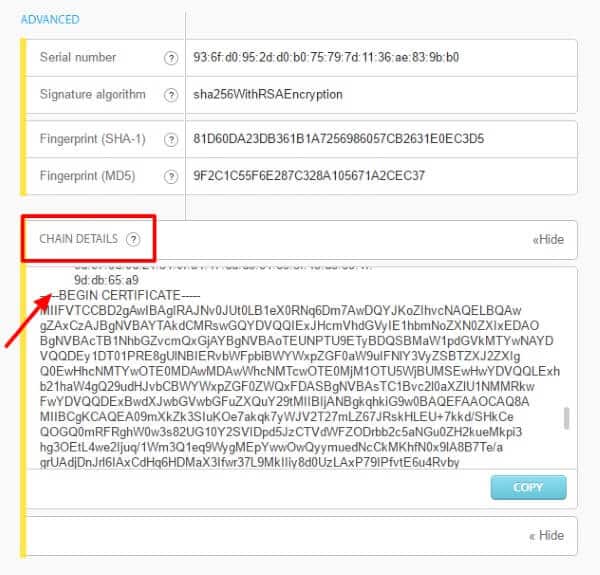 If you are not sure where to find your certificate, you can use the SSL checker tool. Enter your hostname in the Enter hostname field and click the Check button, scroll to the end of the page and click on Show in the Chain Details field. At the end of this field, you will find your certificate.