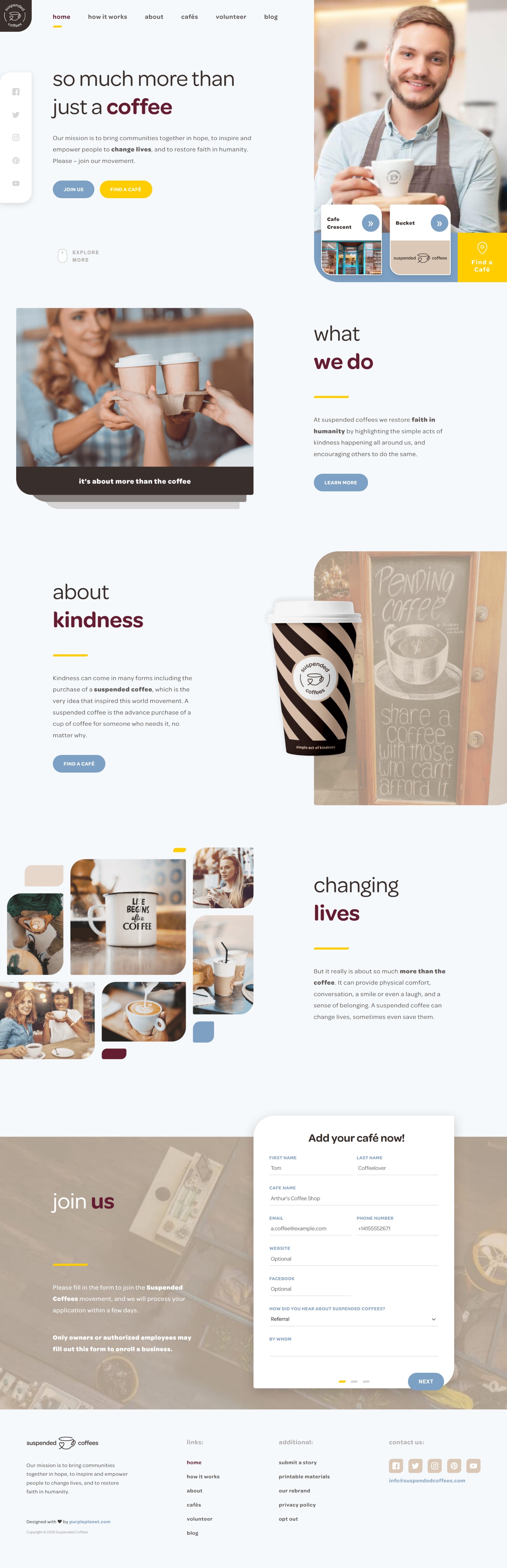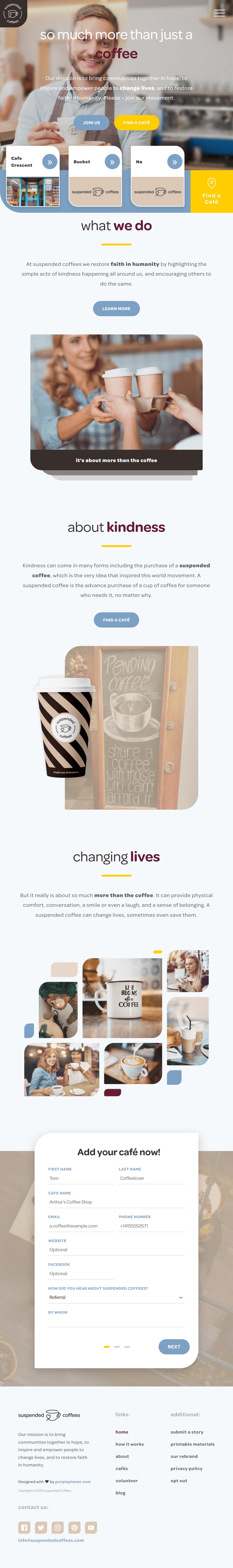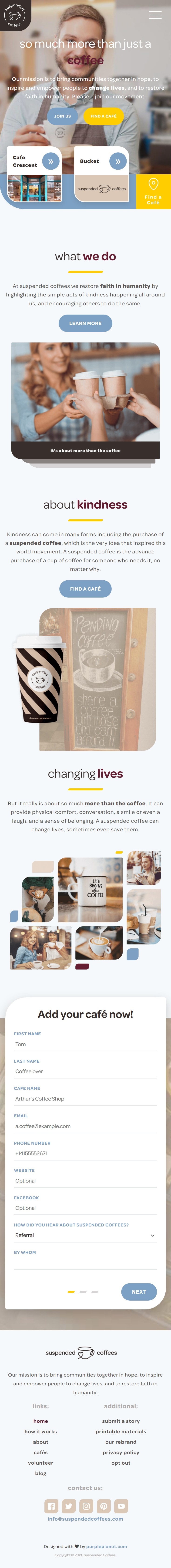 Kindness can come in many forms, including the purchase of a suspended coffee, which is the very idea that inspired this global movement. A suspended coffee is the advance purchase of a cup of coffee for someone who needs it, no matter why. Suspended Coffees approached purpleplanet to help translate this simple, human idea into a warm, modern digital presence that could support growth and engagement worldwide.